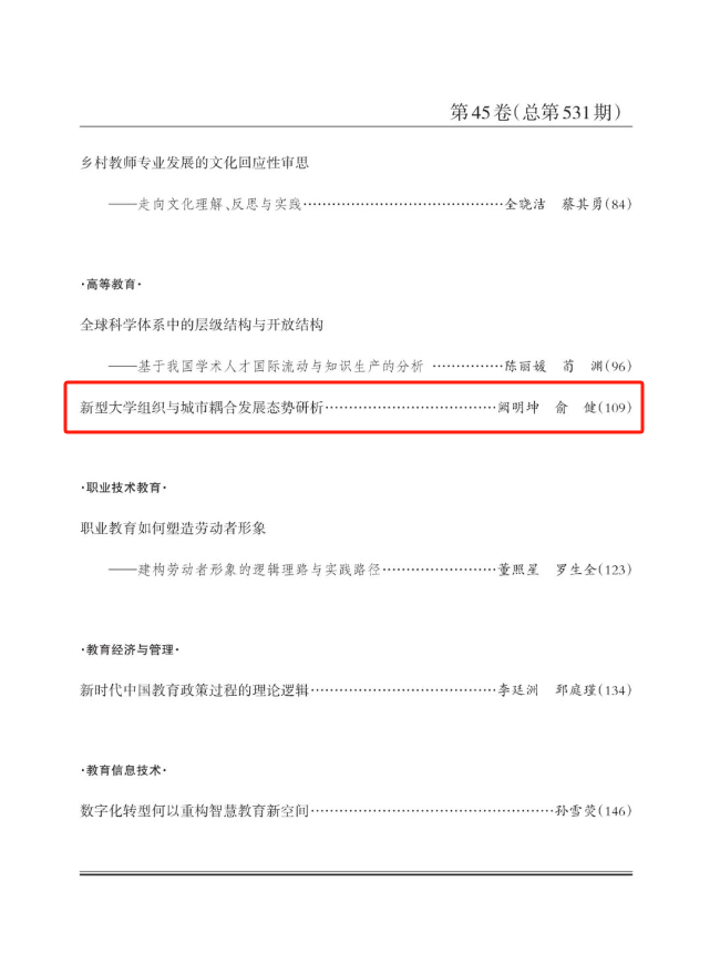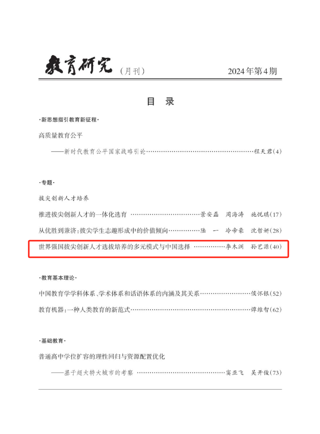 新葡京博彩官网(中国)官方网站 “百人计划”研究员李木洲、新葡京博彩官网(中国)官方网站 2022级教育史专业硕士研究生孙艺源的学术论文《世界强国拔尖创新人才选拔培养的多元模式与中国选择》和新葡京博彩官网(中国)官方网站 兼任研究员阙明坤、广州大学党委学生工作部助理研究员俞健的学术论文《新型大学组织与城市耦合发展态势研析》在2024年第4期《教育研究》上刊发。