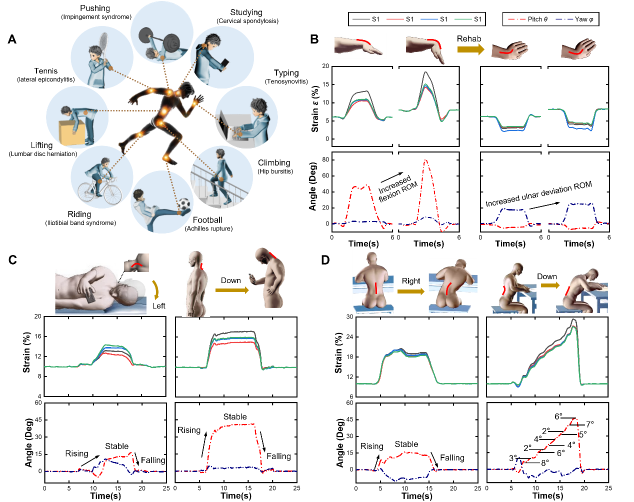 (a)常见日常活动中的各种关节;(b)腕部骨折康复评估;(c)颈椎不良姿态监测与预警;(d)脊柱侧弯和腰椎间盘突出监测与预警。