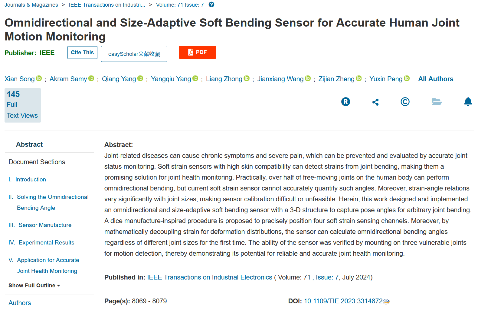 Xian Song, Akram Samy, Qiang Yang, Yanqiu Yang, Liang Zhong, Jianxiang Wang, Zijian Zheng, Yuxin Peng*. Omnidirectional and size-adaptive soft bending sensor for accurate human joint motion monitoring. IEEE Transactions on Industrial Electronics. 2024, 71(7): 8069-8079.(DOI: 10.1109/TIE.2023.3314872)
