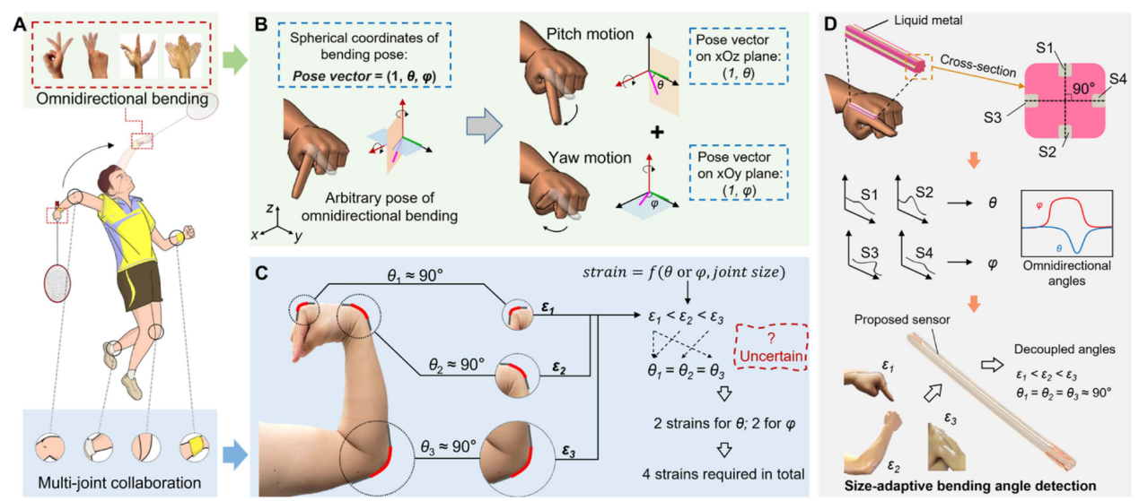 (a)日常活动大多需要不同多轴关节配合;(b)空间坐标系统下全向弯曲的表征方式;(c)单一应变输出只能获得不确定角度的原因;(d)基于形变解耦的多向弯曲传感器实现模式。