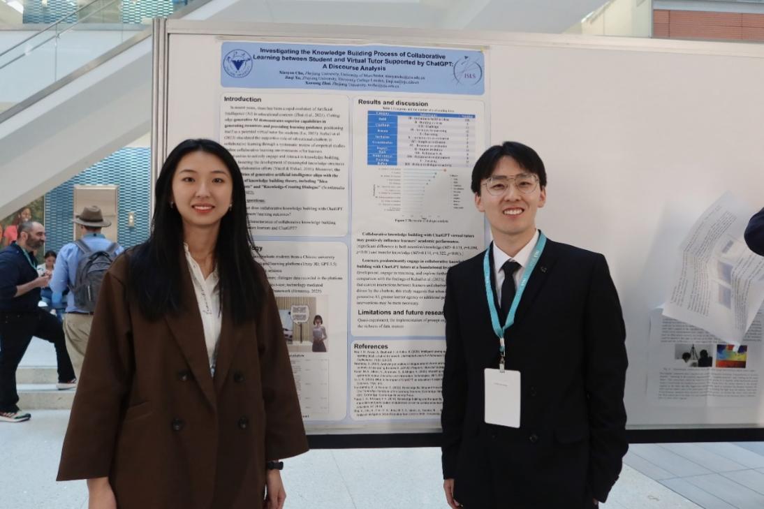 大会上,两位同学围绕“Investigating the Knowledge Building Process of Collaborative Learning between Student and Virtual Tutor Supported by ChatGPT: A Discourse Analysis”的研究做了海报展示,在导师翟雪松特聘研究员的指导下,本研究探讨了ChatGPT支持学生与虚拟助教之间协作学习与知识构建过程中的作用,运用话语分析的方法揭示了人机协作中学习互动的特点。