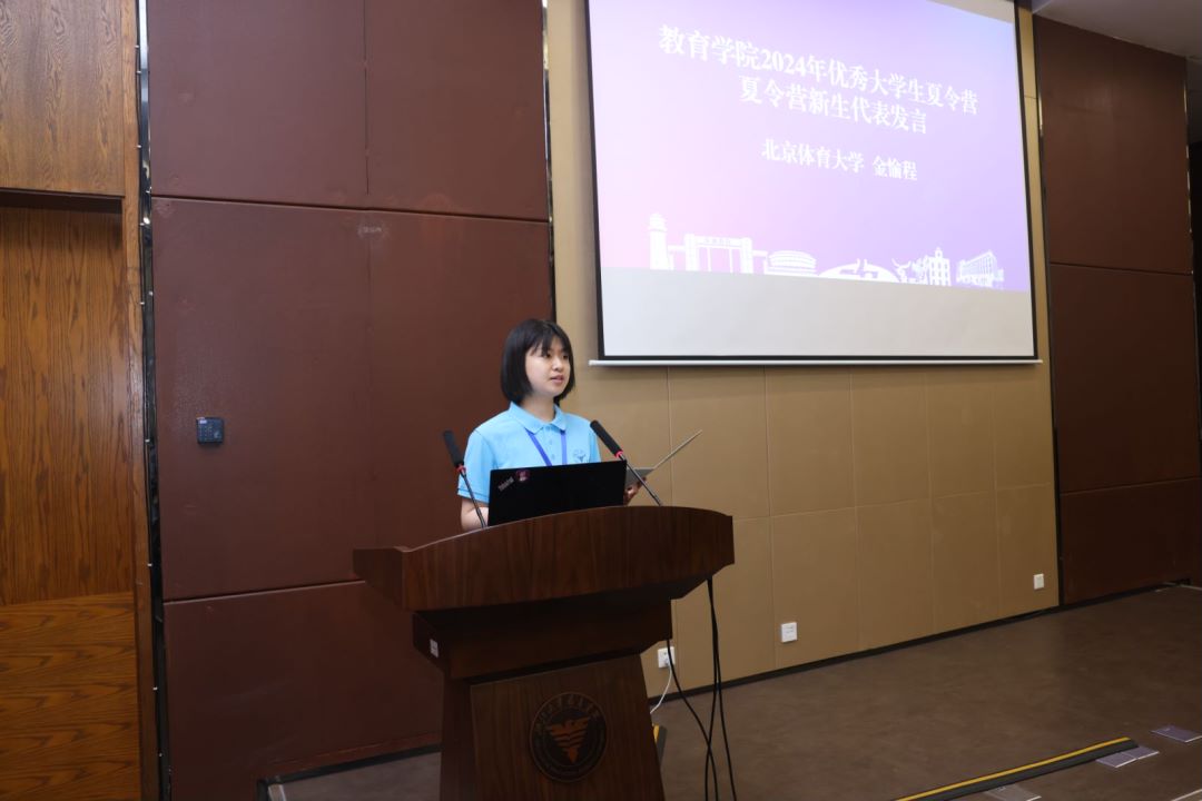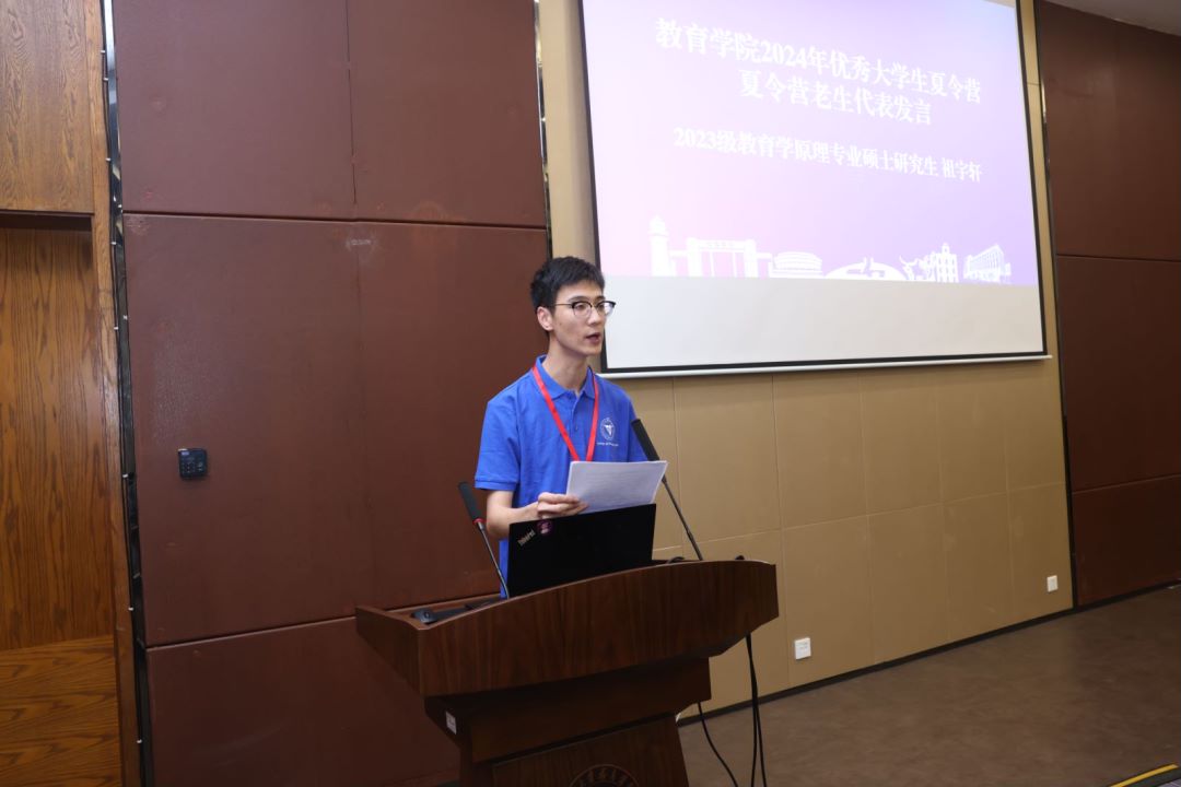 2023级教育学原理专业硕士研究生祖宇轩同学作为夏令营老生代表发言,他分享了自己两年前参与夏令营的经历和目前在浙江大学的学习感悟,并鼓励各位营员怀揣梦想,带着对浙大的期待与对学术的抱负,珍惜和享受此次夏令营。北京体育大学的金愉程同学代表夏令营全体营员发言,表达了自己对浙大新葡京博彩官网(中国)官方网站 的向往,抒发了自己对教育事业的理想和信念,并期待在夏令营期间与老师们进行学术碰撞与交流,与同学们相互了解、增进友谊。