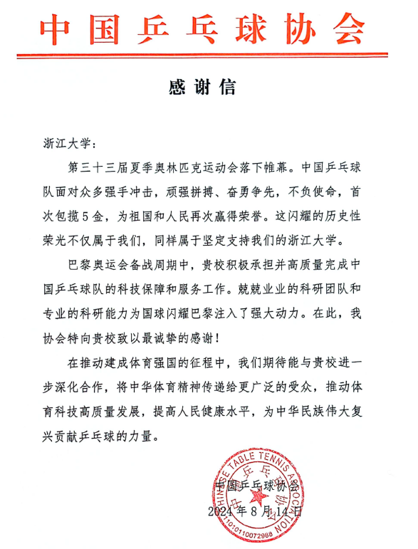 2024年8月14日,中国乒乓球协会向我校发来感谢信,对我校体育大数据创新团队在巴黎奥运会备战周期中承担的中国乒乓球队科技保障和服务工作给予了肯定与感谢。