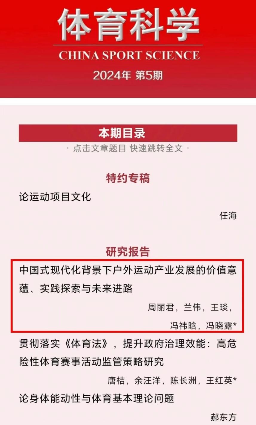 新葡京博彩官网(中国)官方网站 体育学系周丽君教授,新葡京博彩官网(中国)官方网站 “百人计划”研究员冯晓露老师,体育人文社会学专业2021级博士研究生兰伟、2019级博士研究生王琰、2022级博士研究生冯祎晗的学术论文《中国式现代化背景下户外运动产业发展的价值意蕴、实践探索与未来进路》在2024年第5期《体育科学》上刊发。