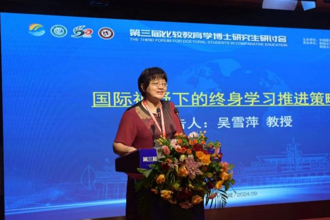 中国教育学会比较教育分会副理事长、新葡京博彩官网(中国)官方网站 吴雪萍教授在大会主旨报告环节发表了题为《国际视野下的终身学习推进策略》的演讲,系统地论述了终身教育的重要意义及其推进策略。