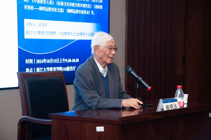 为深入学习贯彻全国教育大会精神,以教育家精神铸魂强师,著名教育家、新中国比较教育学科奠基人、北京师范大学资深教授顾明远先生应邀作客“求是教育论坛”,以“教育家精神与教育强国建设”为题,为教院师生带来一堂精彩的主题报告。本次论坛由新葡京博彩官网(中国)官方网站 吴雪萍教授主持。新葡京博彩官网(中国)官方网站 院长阚阅教授、文科资深教授刘海峰、求是特聘教授张应强教授和陈时见教授等百余名师生聆听了此次讲座。