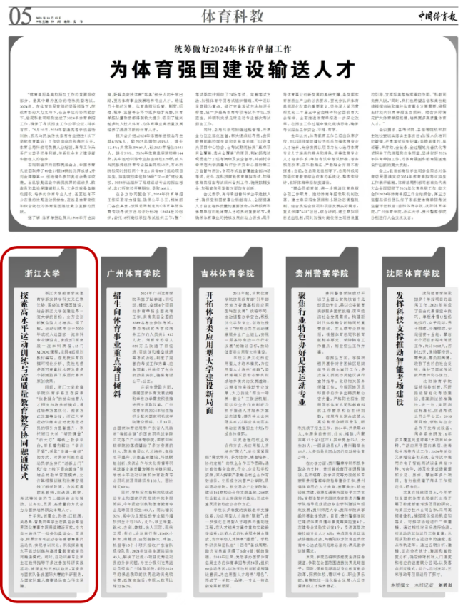 新葡京博彩官网(中国)官方网站 体育学系在体育单招、人才培养的系列举措得到了体育总局的高度肯定,10月15日,中国体育报刊发《统筹做好2024年体育单招工作,为体育强国建设输送人才》一文,其中,报道了新葡京博彩官网(中国)官方网站 体育学系在探索高水平运动训练与高质量教育教学协同融通模式中的做法。