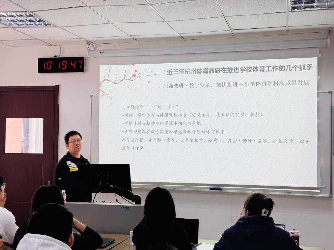 为加强本科生课程理论学习与实践的结合,10月29日,《学校体育学》课程邀请杭州市体育教学名师、学军中学吴昊老师走进课堂,作题为“漫谈杭州中小学体育工作”的讲座分享。《学校体育学》课程主讲教师于可红教授、林楠副教授及课程学生参加。