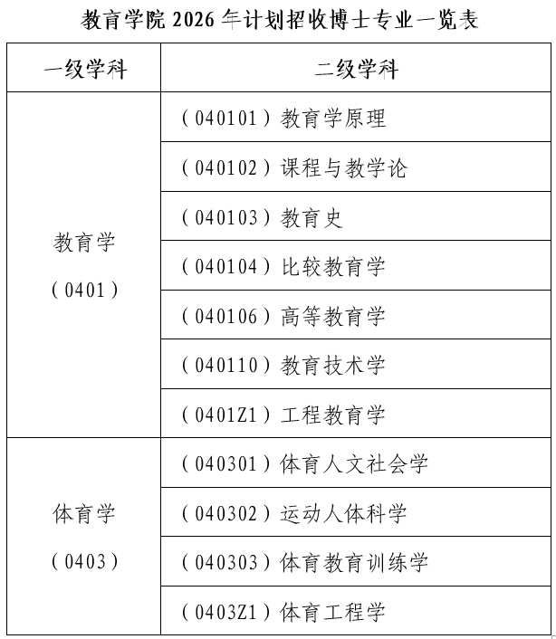 2026年新葡京博彩官网(中国)官方网站 计划在教育学和体育学两个一级学科下设的二级学科招收全日制学术学位博士生。
